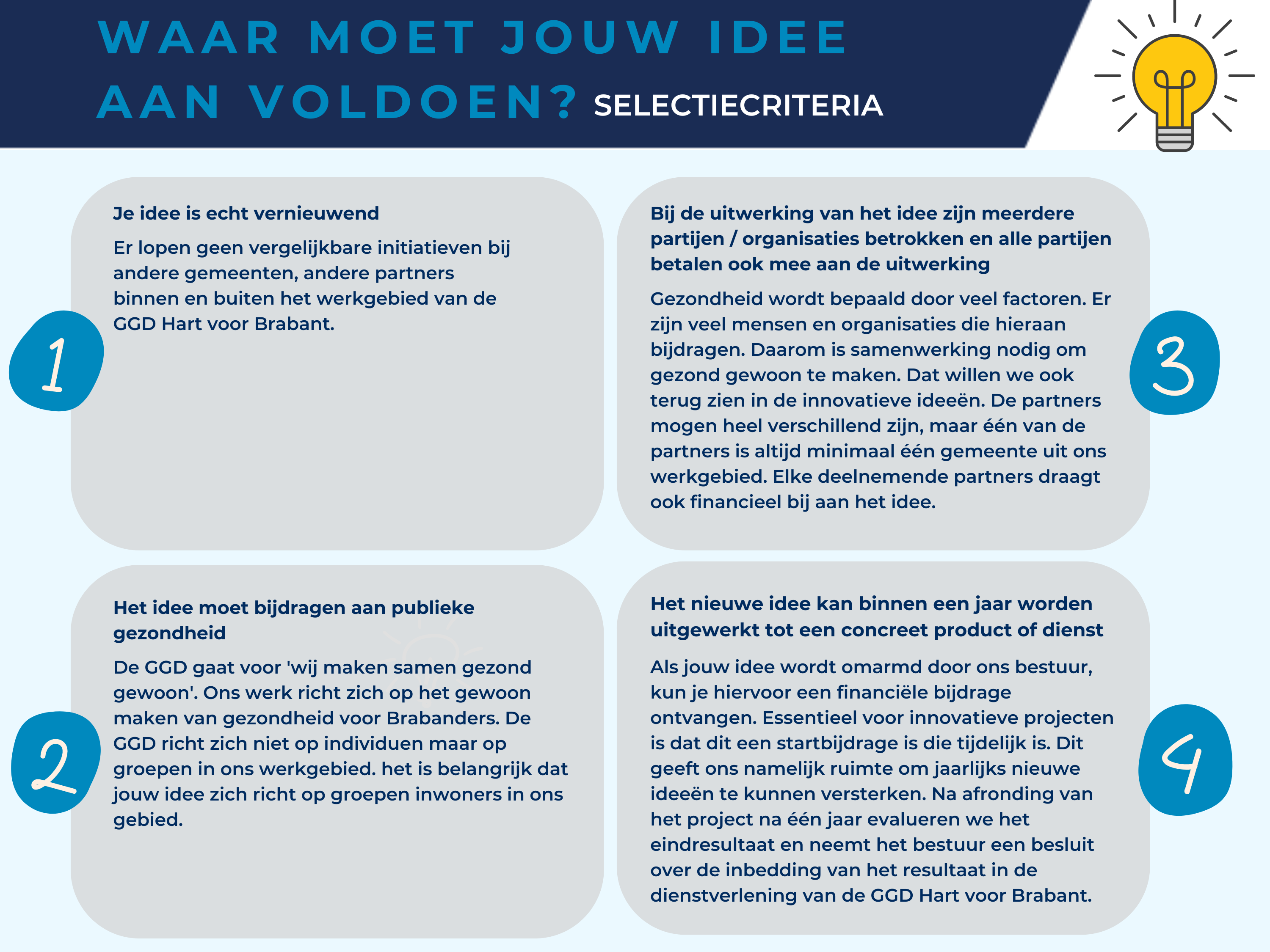 Jaarlijks kan iedereen die een goed idee heeft om publieke gezondheid te verbeteren, het idee indienen bij de GGD. Het idee moet een goede bijdrage met impact hebben op onze inwoners.